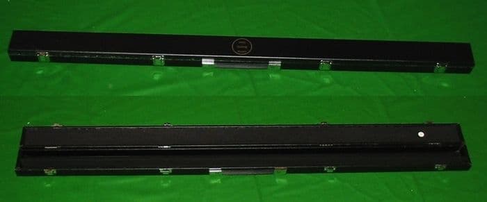 The case is of wooden construction and has a leather look finish on the outside and 2 section velvety black padded lining inside to hold your cue securely.